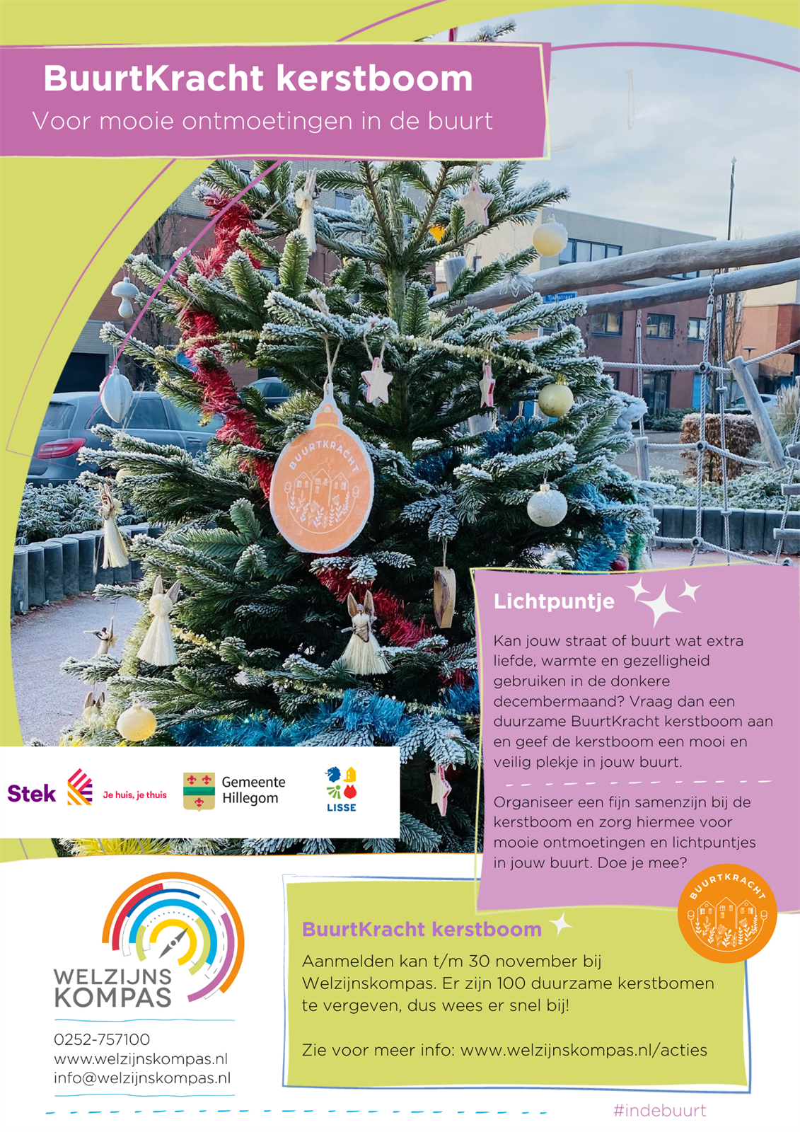 Om te zorgen voor nóg meer gezelligheid en lichtpuntjes in de straten van Hillegom en Lisse, kunnen inwoners ook dit jaar weer een BuurtKracht kerstboom aanvragen voor de straat of buurt.