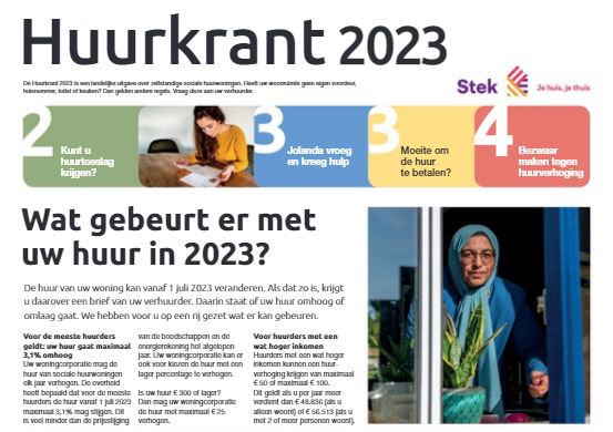 Lees meerPer 1 juli 2023 passen wij de huren aan. Sommige huurders krijgen een huurverhoging en anderen een huurverlaging. De huur kan ook gelijk blijven. De huur is de belangrijkste inkomstenbron voor Stek. We houden de kwaliteit van woningen ermee in stand en het maakt het mogelijk om nieuwe woningen tegen betaalbare prijzen te bouwen. Ook gebruiken we deze inkomsten om de leefbaarheid van de woonomgeving te verbeteren.