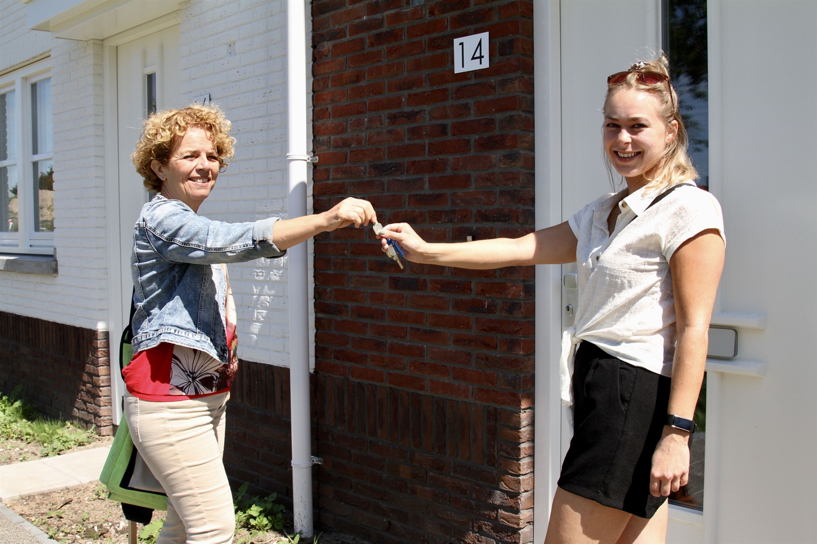 Fotobijschrift:Verhuurmakelaar Petra Jansen van Stek (links) overhandigt de sleutel aan nieuwe huurster Céline Broekhof.